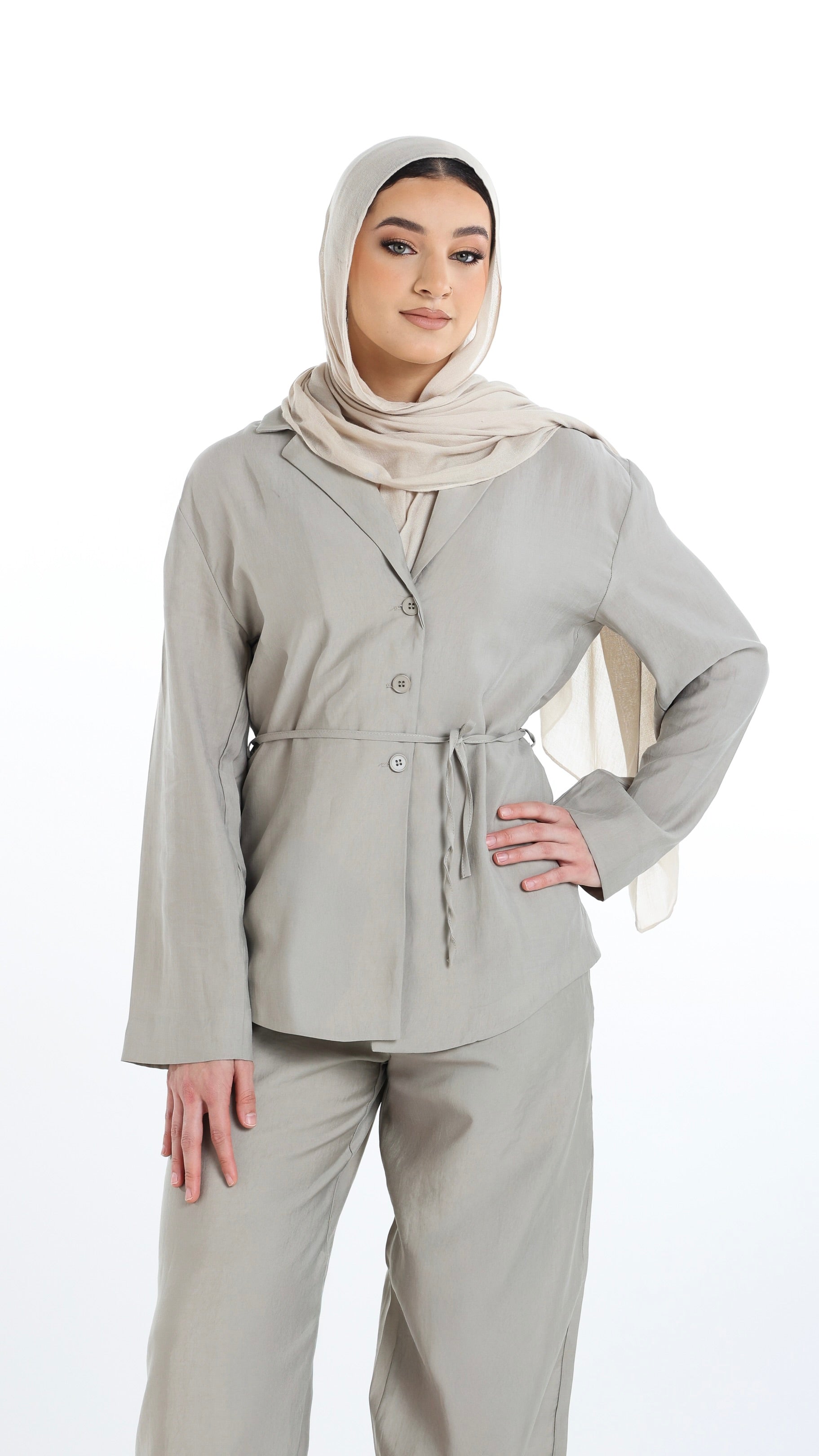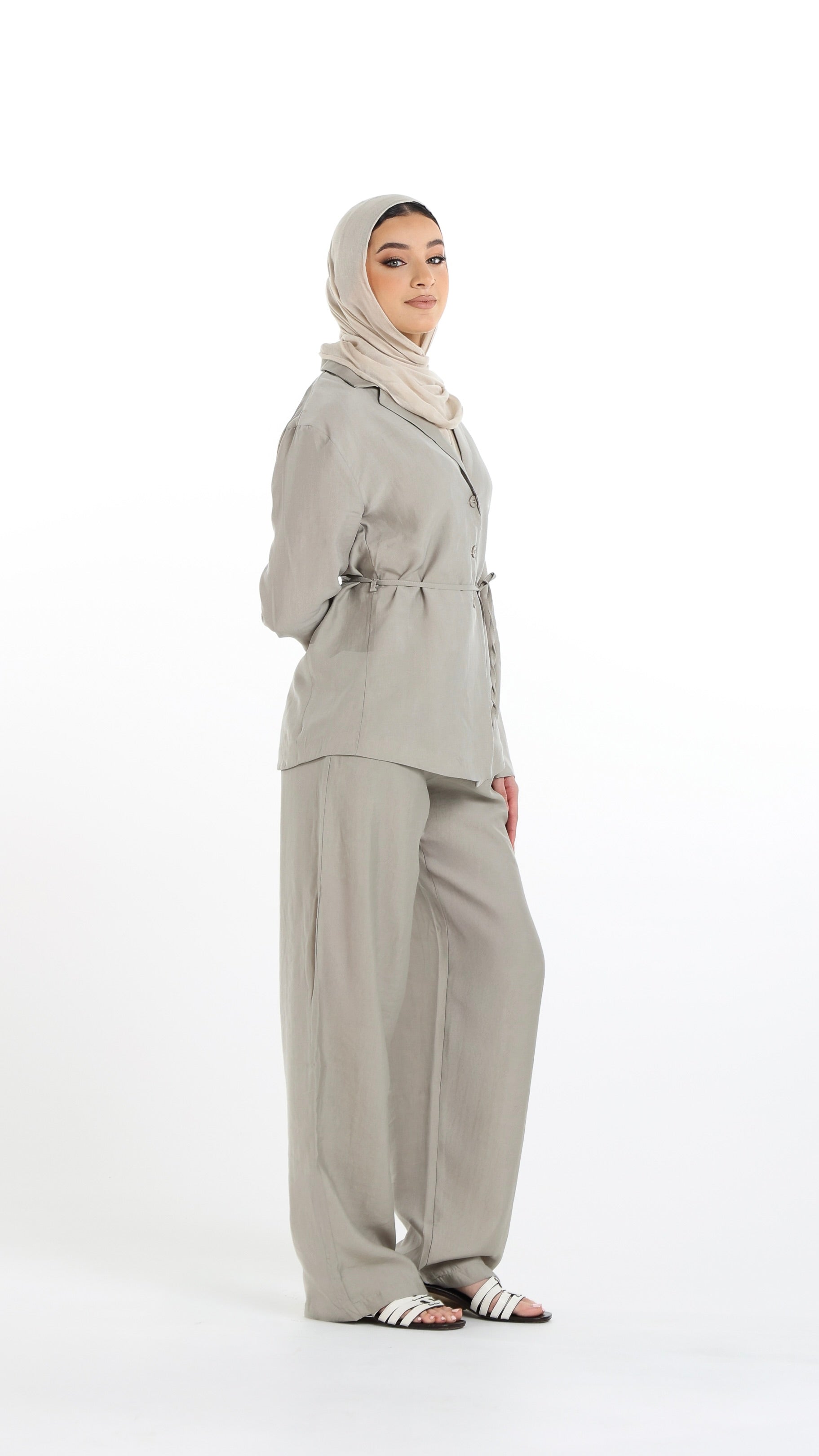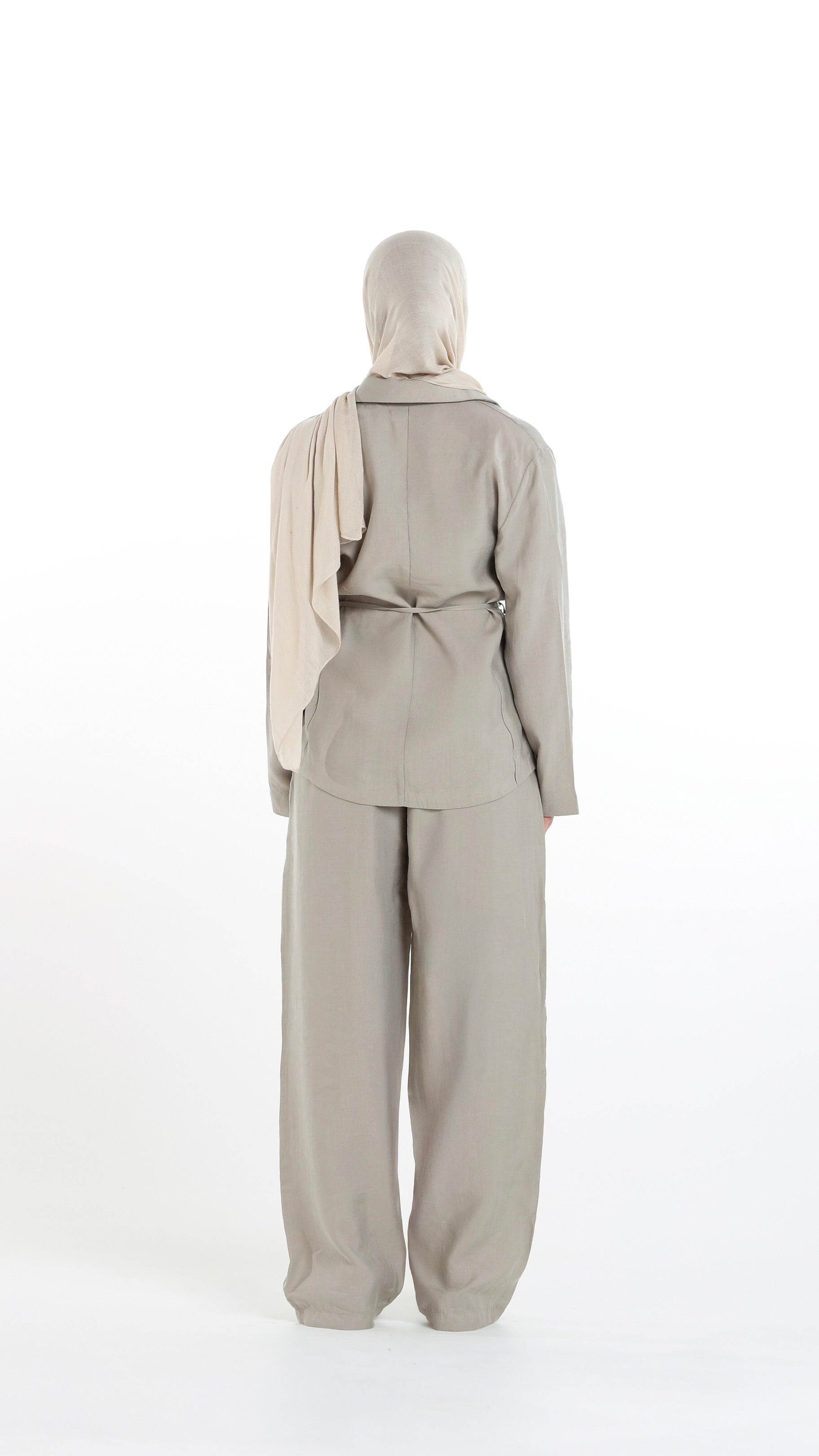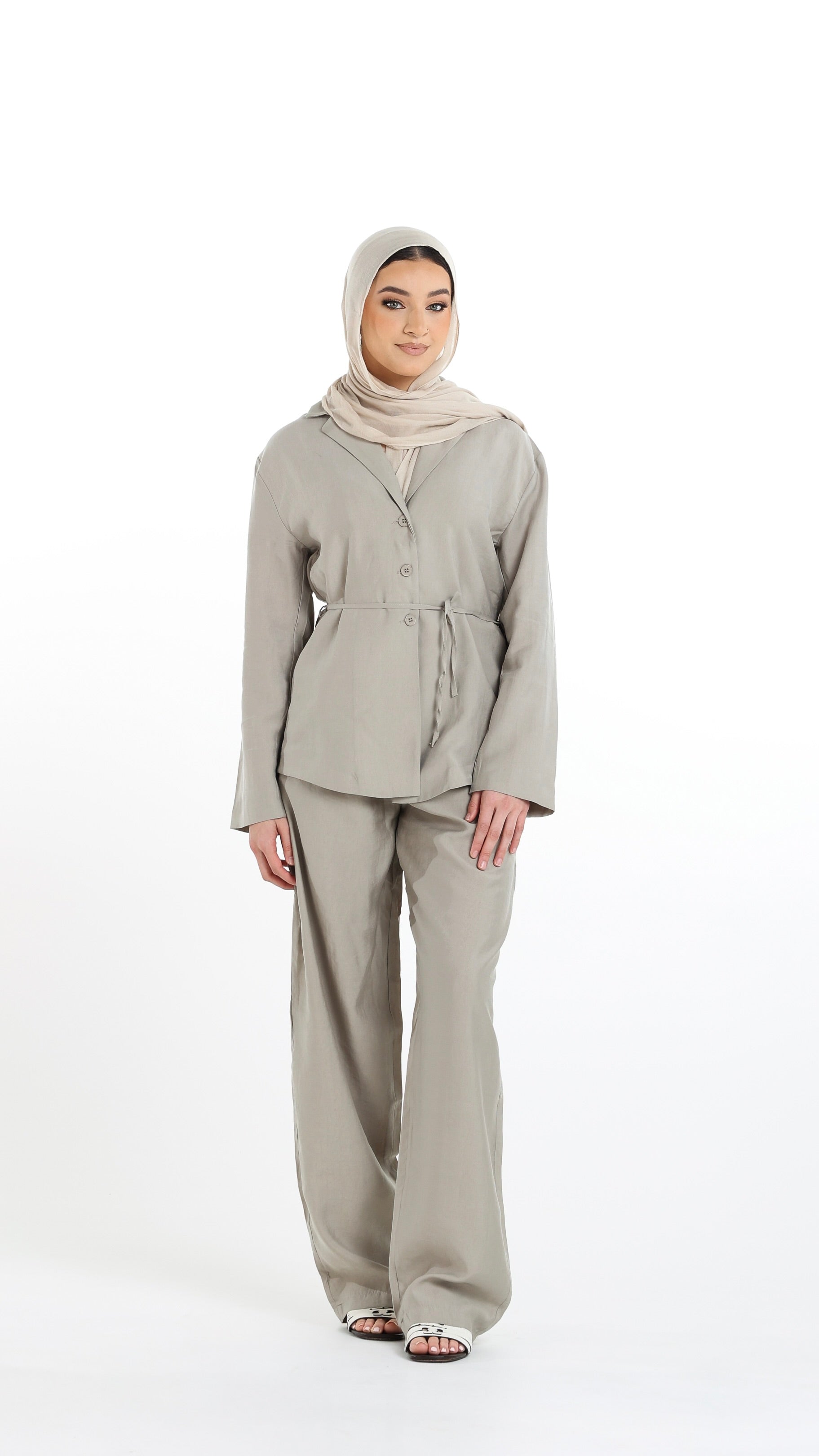 This outfit is a light summer set in a soft light olive beige tone, featuring a relaxed-fit blazer with a waist tie and wide-leg trousers. The fabric is breathable and flowy, perfect for warm summer weather.