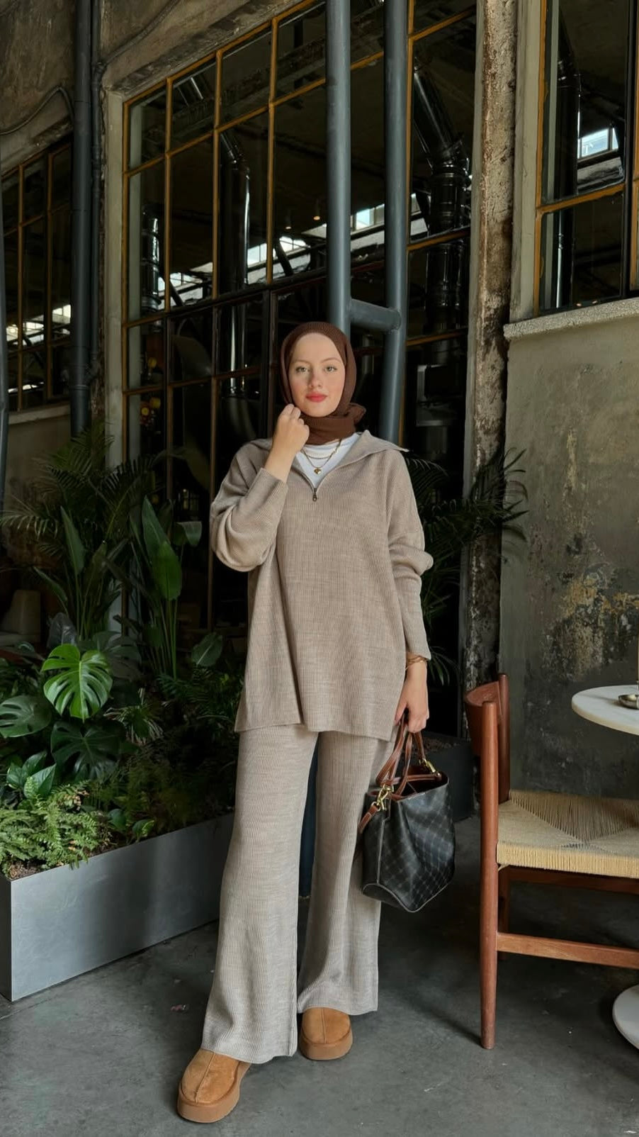 Beige Knit Lounge Set - Zip Hoodie & Wide-Leg Pants